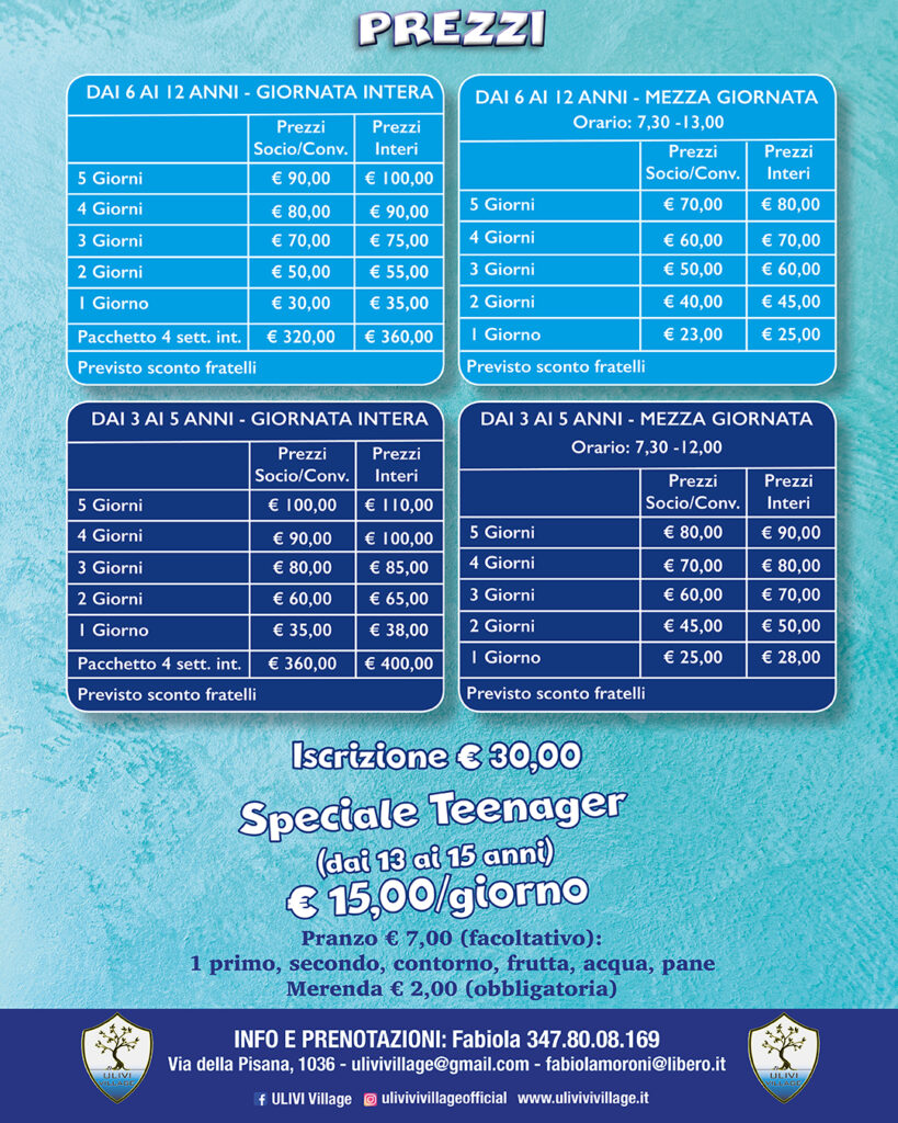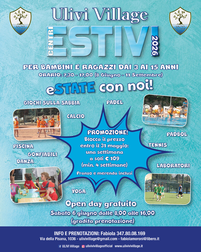 I centri estivi rappresentano, da anni, il vero e proprio fiore all’occhiello degli Ulivi Village. Fin dalla nascita Fabiola Moroni è stata in grado di far crescere un vero e proprio movimento che può contare, ogni estate, centinaia di bambini/e e ragazzi/e che si divertono insieme ad uno staff qualificato praticando tantissime attività di ogni tipo: calcio a 5, padel, tennis, beach volley, piscina, balli di gruppo, danza, judo, Padbol, joga e tanto altro ancora per tutti coloro che parteciperanno.